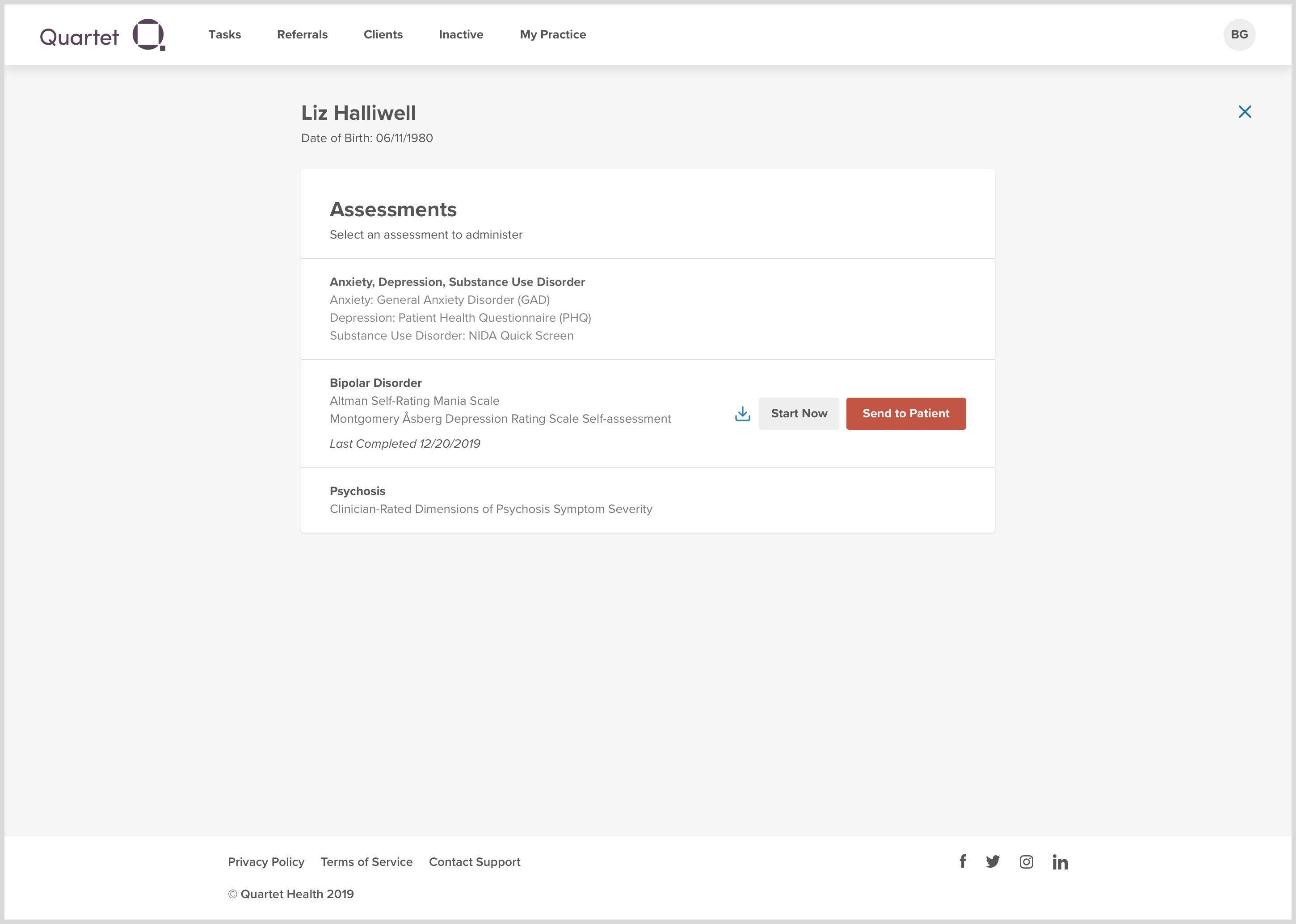 Quartet is a platform that makes it easier for people to get the best mental health care for them. In our commitment to connecting patients with high-quality mental health care, we embarked on an exploration of the role assessments play in diagnosing and treating patients, including those with severe mental illness and how might we use them to measure quality care. Our goal was to enhance the existing assessment experience, empowering our providers to offer the best possible support to their patients.